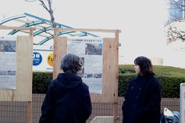 ポスターが掲示できるだけでなく、さまざまな成果物を展示することのできる可動式のポスターパネルです。展示の形式に合わせてレイアウトが変えられるように、フレキシブルなジョイントでそれぞれのパネルを結合しています。一般の方でも組み立てができるように、蝶ネジを用いた簡単な仕組みで、今後駅前の空間を活用した様々な実践に使われます。